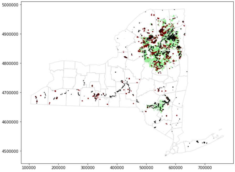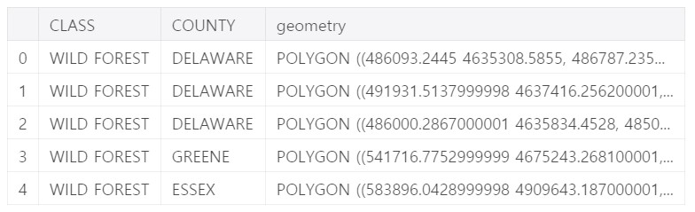 # Select lands that fall under the "WILD FOREST" or "WILDERNESS" category wild_lands = data.loc[data.CLASS.isin(['WILD FOREST', 'WILDERNESS'])].copy() wild_lands.head() |
